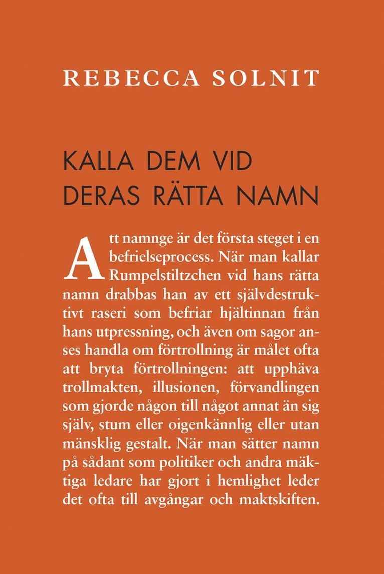 Fri frakt för medlemmar vid köp för minst 249 kr.Ljuga i offentligheten går att göra på många olika sätt, påpekar Rebecca Solnit i förordet till essäsamlingen "Kalla dem vid deras rätta namn". ”Man kan ljuga genom att blunda för hela sfärer som påverkar och påverkas, utelämna viktig information eller låta bli att koppla ihop orsak och verkan, genom att framställa information på ett oriktigt sätt – vinkla den eller ge den fel proportioner, eller genom att använda förskönande omskrivningar för våld eller baktaleri av helt normala aktiviteter (…)”.