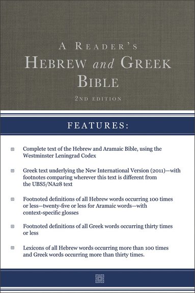Fri frakt för medlemmar vid köp för minst 249 kr.An essential study resource for those studying and reading biblical Hebrew and GreekThis updated reader's Bible combines A Reader's Hebrew Bible and A Reader's Greek New Testament, Third Edition into one convenient and beautiful volume. It offers the following features:Complete text of the Hebrew and Aramaic Bible, using the Westminster Leningrad CodexGreek text underlying the New International Version (2011)--with footnotes comparing wherever this text is different from the UBS5/NA28 textFootnoted definitions of all Hebrew words occurring 100 times or less--twenty-five or less for Aramaic words--with context-specific glossesFootnoted definitions of all Greek words occurring thirty times or lessLexicons of all Hebrew words occurring more than 100 times and Greek words occurring more than thirty times. Ideal for students, pastors, and instructors, A Reader's Hebrew and Greek Bible saves time and effort in studying the Hebrew Old Testament and Greek New Testament. By eliminating the need to look up definitions, the footnotes allow you to more quickly read the Hebrew, Aramaic, and Greek text.Featuring a new lay-flat hardcover in beautiful cloth overboards and a new cream paper for ease of reading and reduced eye strain, A Reader's Hebrew and Greek Bible is a practical, attractive, and surprisingly affordable resource.