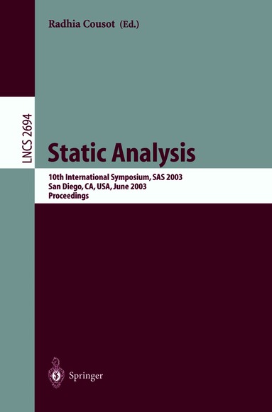 Fri frakt för medlemmar vid köp för minst 249 kr.The refereed proceedings of the 10th International Symposium on Static Analysis, SAS 2003, held in San Diego, CA, USA in June 2003 as part of FCRC 2003. The 25 revised full papers presented together with two invited contributions were carefully reviewed and selected from 82 submissions. The papers are organized in topical sections on static analysis of object-oriented languages, static analysis of concurrent languages, static analysis of functional languages, static analysis of procedural languages, static data analysis, static linear relation analysis, static analysis based program transformation, and static heap analysis.