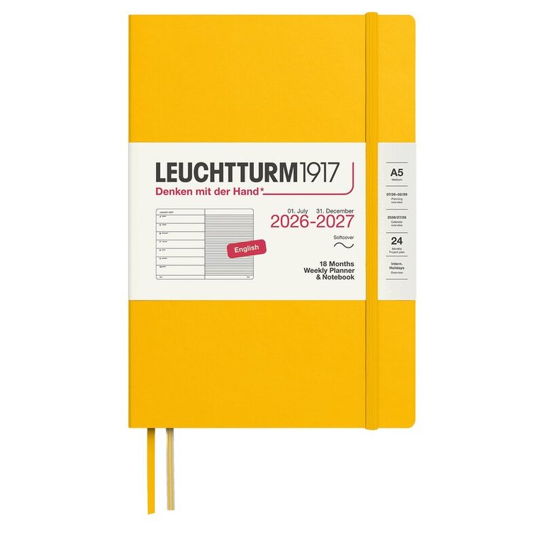Kalender 2026-27 Leuchtturm1917 i A5-format med inbunden hård pärm, 18 månader (juli 2026-december 2027), Weekly Planner med en hel vecka per uppslag. Kalendern innehåller även separat häfte med födelsedagar, dagar att komma ihåg och adressbok. Kraftig förvaringsficka längst bak. Dubbla märkband. Informationssidor med bl a internationella helgdagar i 58 länder, vilket gör det lätt att hitta helgdagar i sitt eget land, praktiskt även vid planering av resor. Projektplaneringsblad. Perforerade avrivningsbara sidor för anteckning. Praktisk resårsnodd som håller ihop kalendern. FSC-certifierat papper. Färg: Forest Green