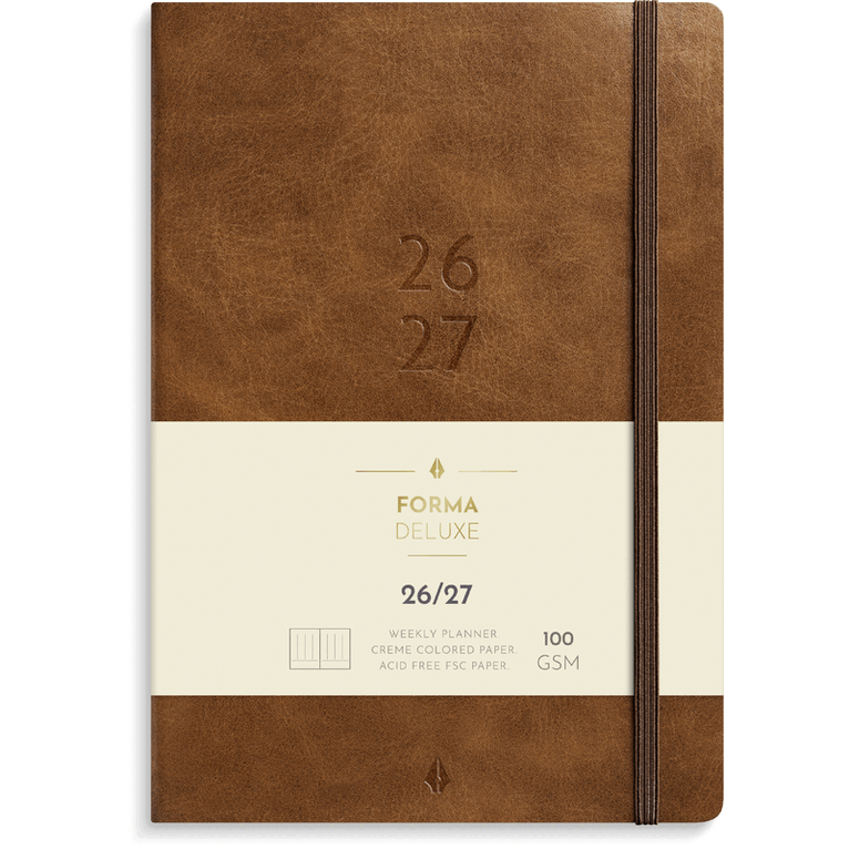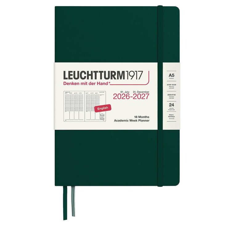Kalender 2026-27 Leuchtturm1917 i A5-format med inbunden hård pärm, 18 månader (juli 2026-december 2027), Weekly Planner & Notebook med veckans dagar på vänster sida och linjerat anteckningsblad på den högra sidan av ett uppslag - kalender och anteckningsbok i ett. Kalendern innehåller även separat häfte med födelsedagar, dagar att komma ihåg och adressbok. Kraftig förvaringsficka längst bak. Dubbla märkband. Informationssidor med bl a internationella helgdagar i 58 länder, vilket gör det lätt att hitta helgdagar i sitt eget land, praktiskt även vid planering av resor. Projektplaneringsblad. Perforerade avrivningsbara sidor för anteckning. Praktisk resårsnodd som håller ihop kalendern. FSC-certifierat papper. Färg: Dusty Rose
