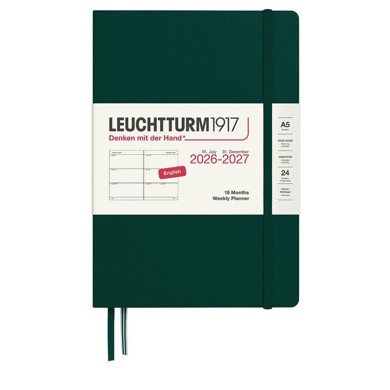 Kalender 2026-27 Leuchtturm1917 i A5-format med inbunden hård pärm, 18 månader (juli 2026-december 2027), Week Planner med en hel vecka per uppslag och vertikal inlaga. Dagarna är tidsindelade mellan 7 och 22, med extra utrymme för anteckning. Kalendern innehåller även separat häfte med födelsedagar, dagar att komma ihåg och adressbok. Kraftig förvaringsficka längst bak. Dubbla märkband. Informationssidor med bl a internationella helgdagar i 58 länder, vilket gör det lätt att hitta helgdagar i sitt eget land, praktiskt även vid planering av resor. Projektplaneringsblad. Perforerade avrivningsbara sidor för anteckning. Praktisk resårsnodd som håller ihop kalendern. FSC-certifierat papper. Färg: Forest Green