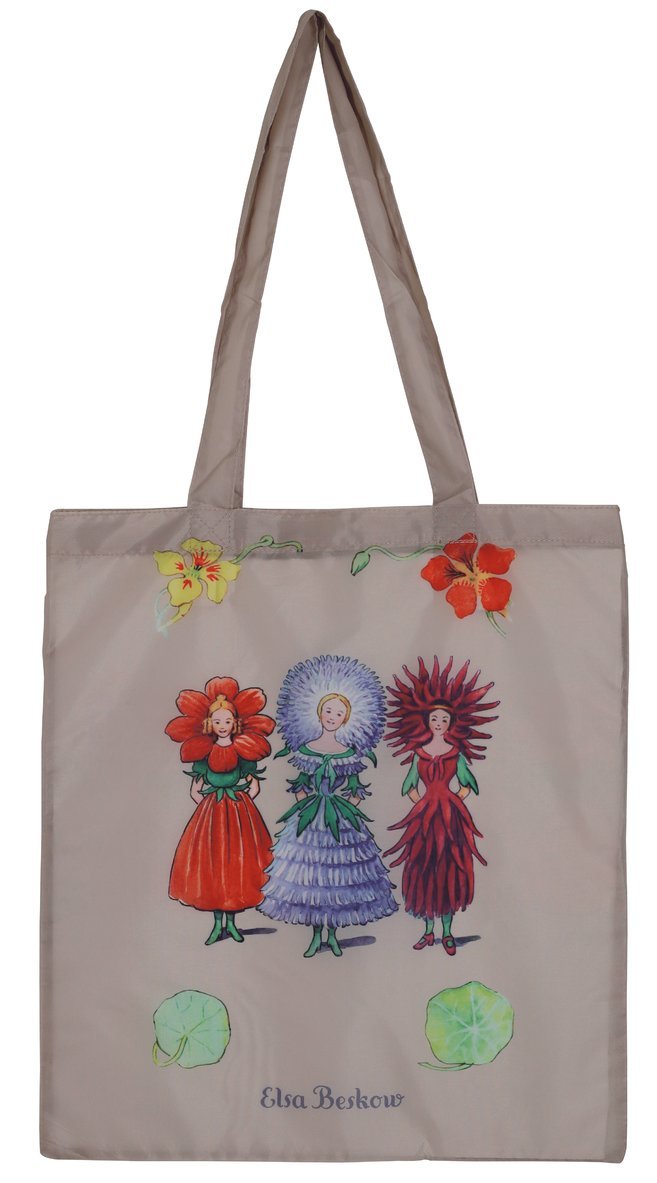 Vacker beige tygkasse att förvara dina saker i för vardagens alla bestyr. Kassen har en praktisk innerficka som den kan vikas ihop i för enkel och smidig förvaring. Motivet är hämtat ur Elsa Beskows bilderbok Blomsterfesten i täppan från 1914. En saga där trädgårdens alla blommor och växter anländer i en färgsprakande parad för att fira midsommar.